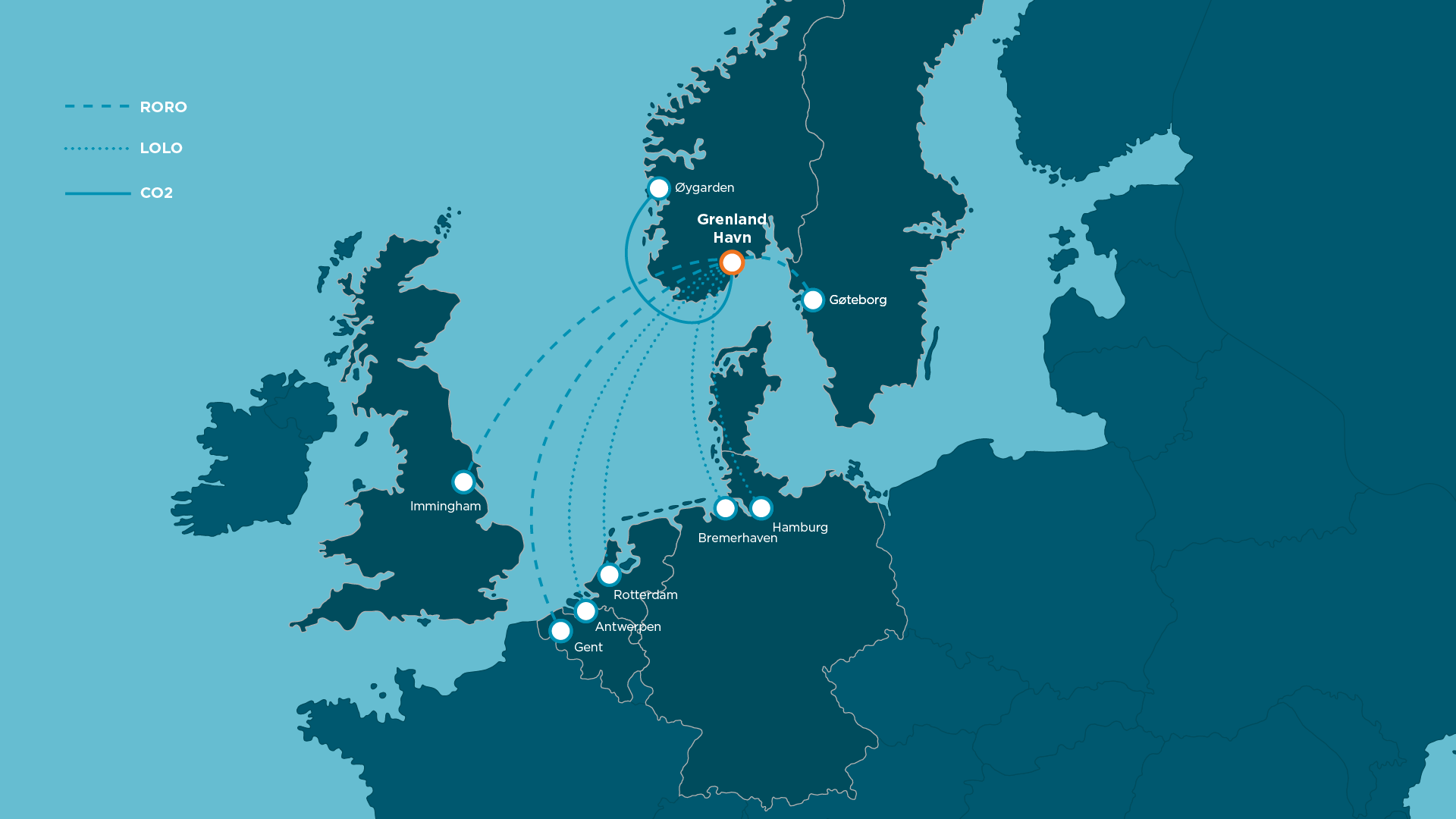 I Grenland Havn har vi faste forbindelser til Sverige, Nederland, Storbritannia, Tyskland og Belgia. I tillegg går CO2-fartøyene til Northern Lights fra Breviksterminalen til Øygarden lastet med flytende CO2 som er fanget på Heidelberg Materials’ sementfabrikk i Brevik.